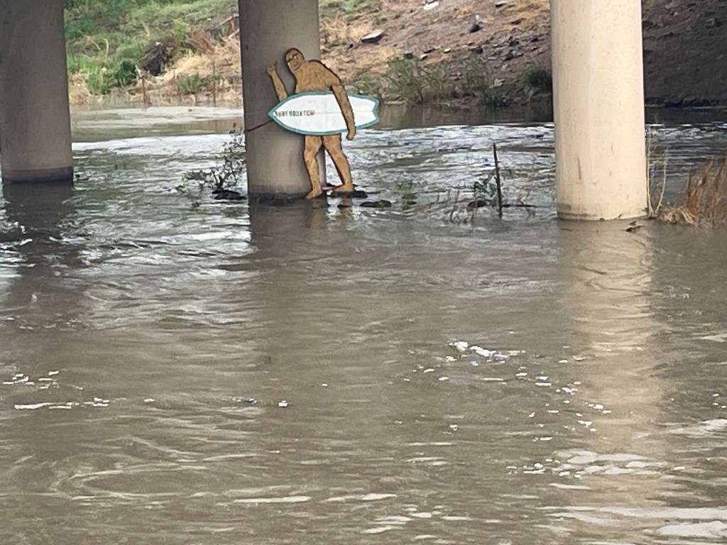 Trestles Wave downtown might be up early today but that wave is gnarly and the seam on the left after coming off the waves can be tricky since it is aerated causing the surfer to be less buoyant when even with a pfd on and will drop you below water level for a bit of a scare. Surf Trestles with a backup plan and scout down river for the eddy/exit spots (takeouts), strainers, etc. before trying to surf. Bring a kayak friend to assist or a friend with swift water knowledge/training and a throw bag. Place is no joke.