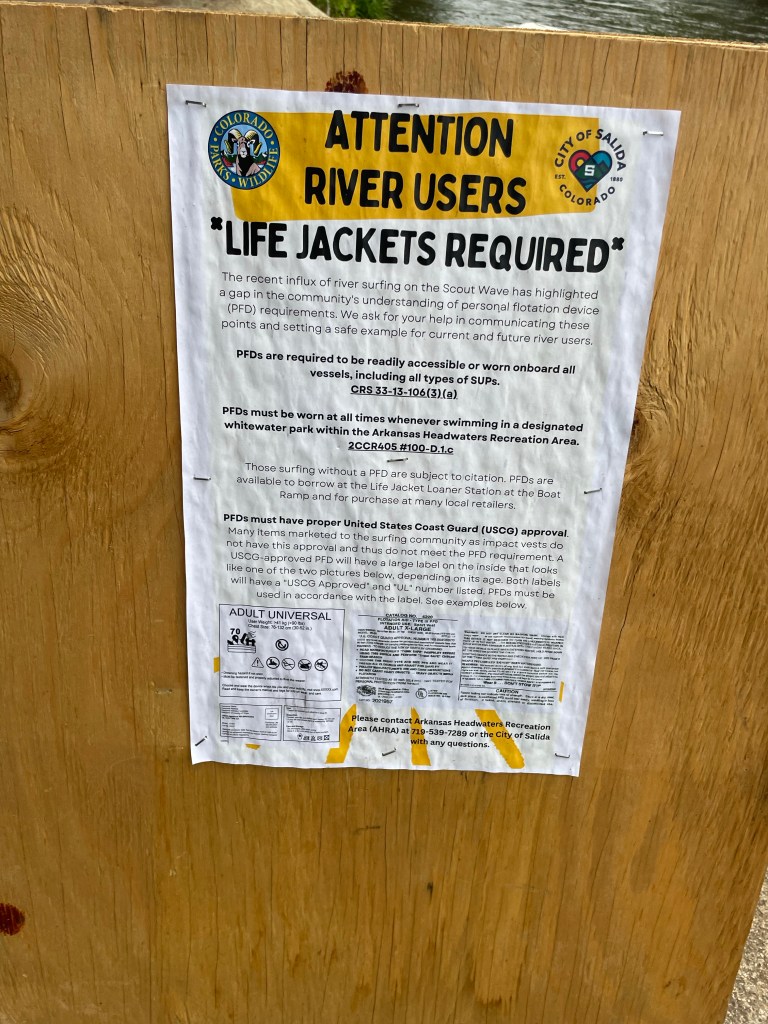 In August 2023, the controversy of having to use a certified Coast Guard Approved personal floatation device (referred to as “CGA PFD” or “certified vest”) while river surfing the the Scout Wave in Salida, Colorado was raised by Colorado Parks & Wildlife (CPW) and their Park Rangers. A full write-up was posted on The Denver Surf Report (see: https://denversurfreport.blog/2023/08/13/pfd-controversy-at-scout-wave-beyond/).