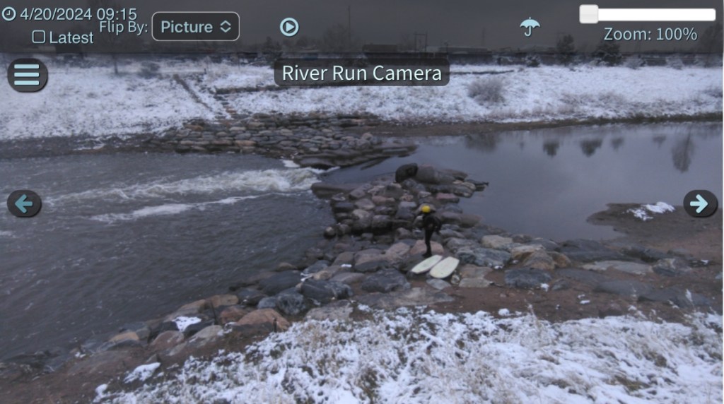 Chatty will likely hold at 110cfs but Sixx is surfable with the spring storm precipitation keeping the total flow high enough for a shortboard but may need a bit longer stick if it drops down more. The water is frigid in the mid to upper 40° that along with cold air today will require 5/4 wetsuit w/ a hood, 5mm gloves, 5mm booties.