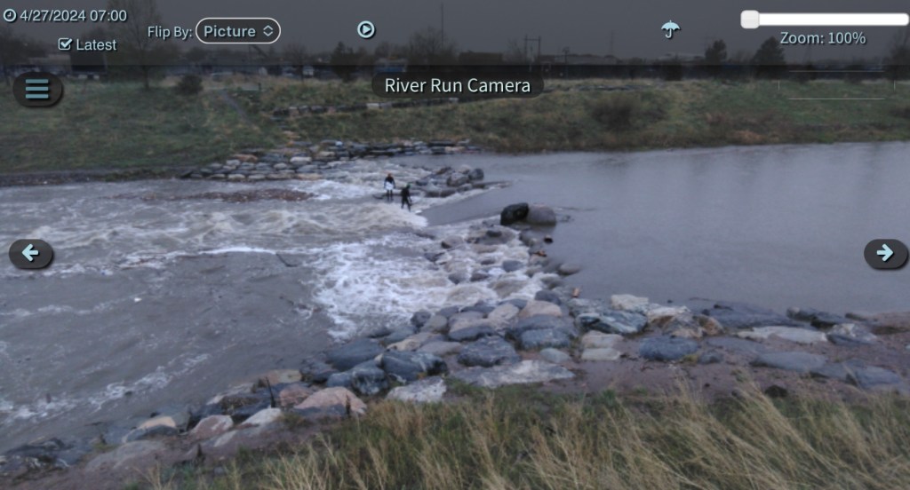 Sixx was surfed at 7am but looks like it has blown out. Sixx might be surfable if the flow backs off. We do know from experience that Sixx can’t be shaped over 650cfs. The pole cam is your friend today. The gauge might hang up for hours at a time but will give you an idea what the trend is of going up or dropping down.
