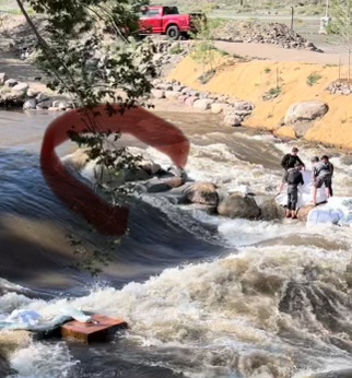 NDE: Yesterday their was apparently a near death experience (NDE) at high flow Scout Wave when a surfer attempted to cross over the top of the wave to the “sunny side” (aka goofy footer side) and their board went one way and the surfer the other way on the top of the wave. See pic of spot where it happened. The surfer was pulled under and likely only survived when their leash broke. I would like to speak with the surfer and will keep their name anonymous like I have done with other surfers experiencing NDE’s while river surfing. Anyone with details, please contact me in person or by e-mail on the contact The Denver Surf Report sub-page.
