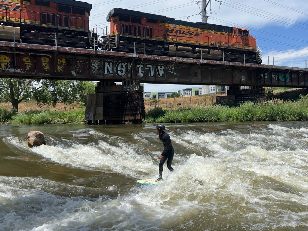 Trestles Wave (downtown Denver): Trestles Wave is seeing almost a thousand cfs today and was the same flow yesterday when we surfed it. Kind of like a mini-Benni’s right now (becomes more like Big-Benni’s when the cfs goes even higher to 1,500+cfs). Spot is secluded next to train tracks but easily accessed, but don’t go alone. The rocks are a bit sharp on the edges in the water and the currents behind the wave is strangely aerated and you sink low when swimming out back. Kind of novelty wave but real cool to claim and you can make fun turns on it, so maybe it is not a “novelty wave”. To surf it you shimmy out as far as you can next to the wave about knee/thigh deep on surfers left (river right) and jump on prone for a pop-op on to your board or prone surfed on a bodyboard or surfmat. Leashes are frowned upon here.