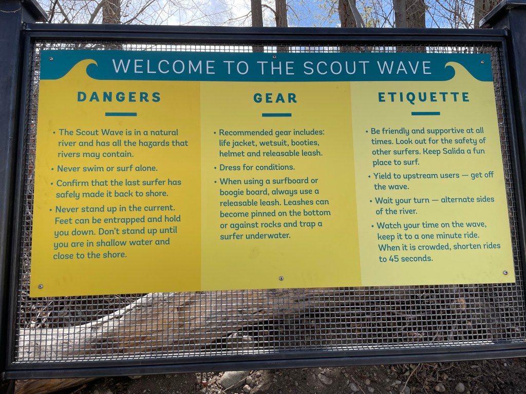 River Surfing Tip: Surfing etiquette is a learned skill be it ocean surfing or river surfing. Take the time to educate yourself. The Scout Wave has a very good explanation of what river surfing etiquette is on their sign next to the wave.